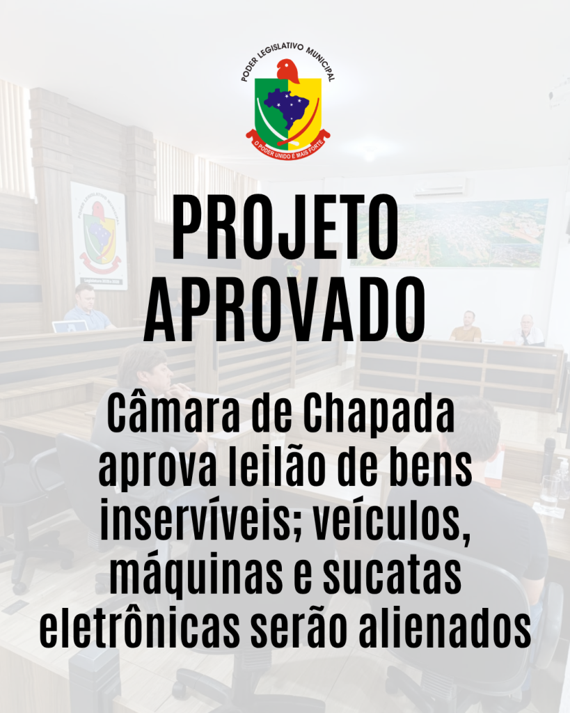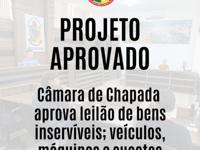 Em sessão realizada na Câmara Municipal, foi aprovado o Projeto de Lei nº 017/2026, de autoria do Poder Executivo, que autoriza o município de Chapada a realizar um leilão público para a venda de bens móveis considerados inservíveis. A medida visa dar um destino útil a materiais que hoje geram custos de manutenção ou ocupam espaço físico sem produtividade, permitindo que os recursos arrecadados sejam reinvestidos em melhorias para a comunidade.